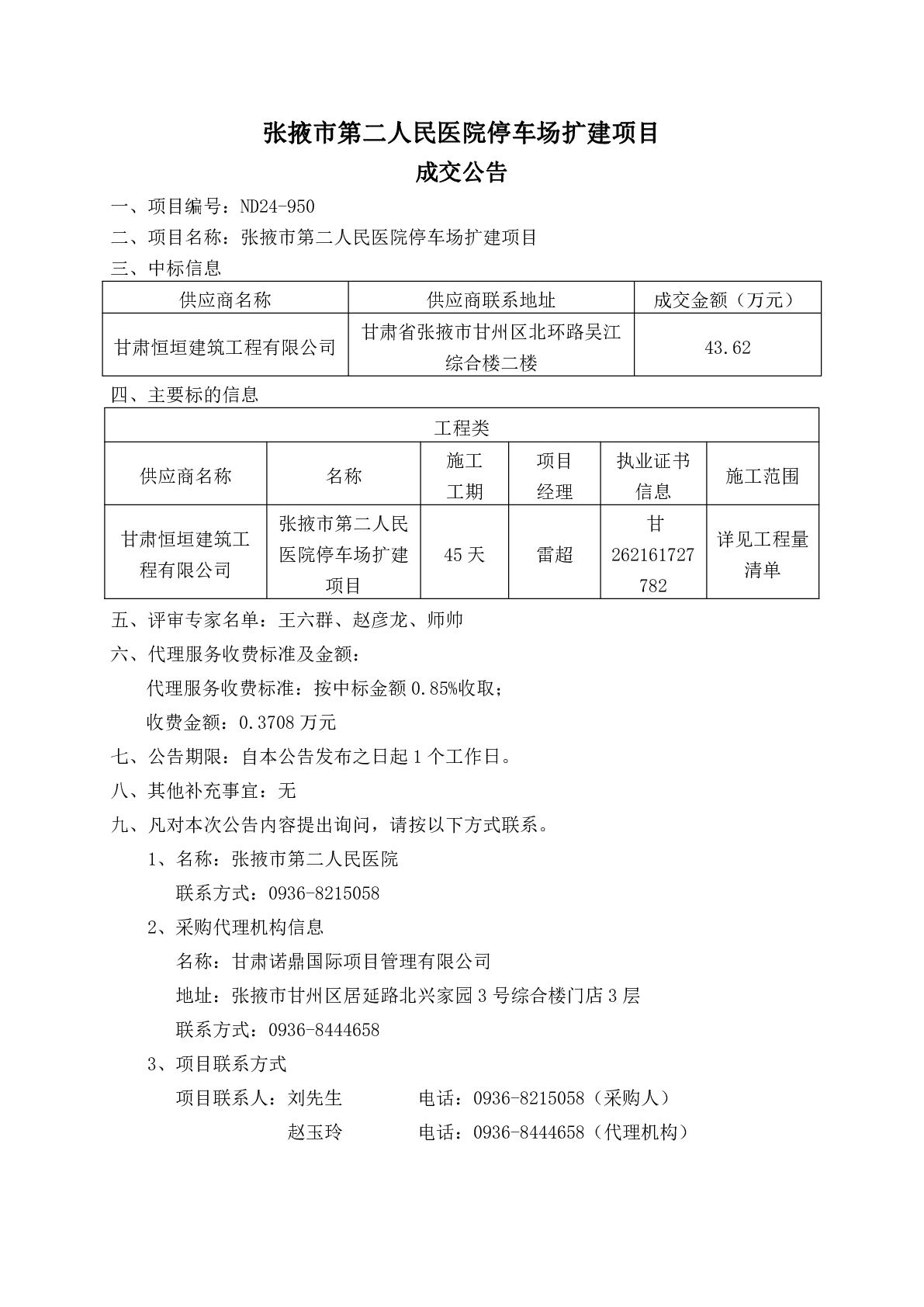 張掖市第二人民醫(yī)院停車場擴建項目成交公告