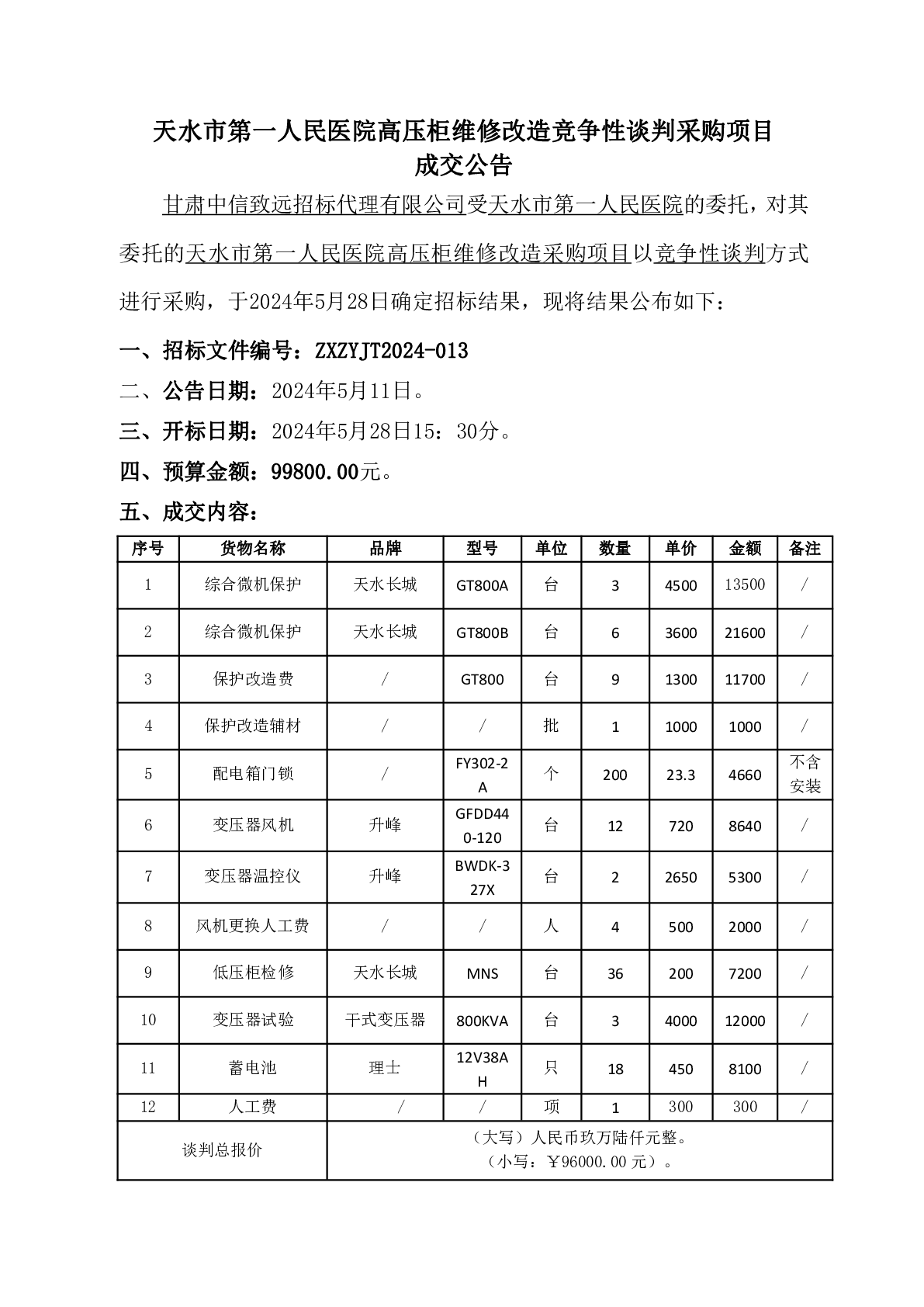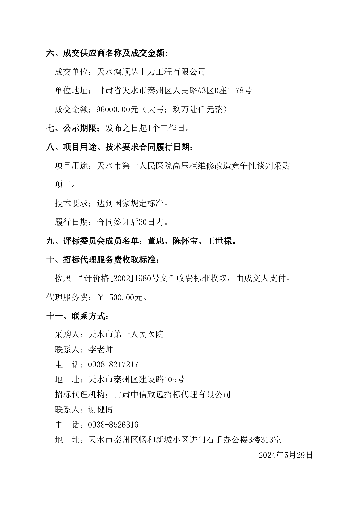 天水市第一人民醫(yī)院高壓柜維修改造競爭性談判采購項目成交公告