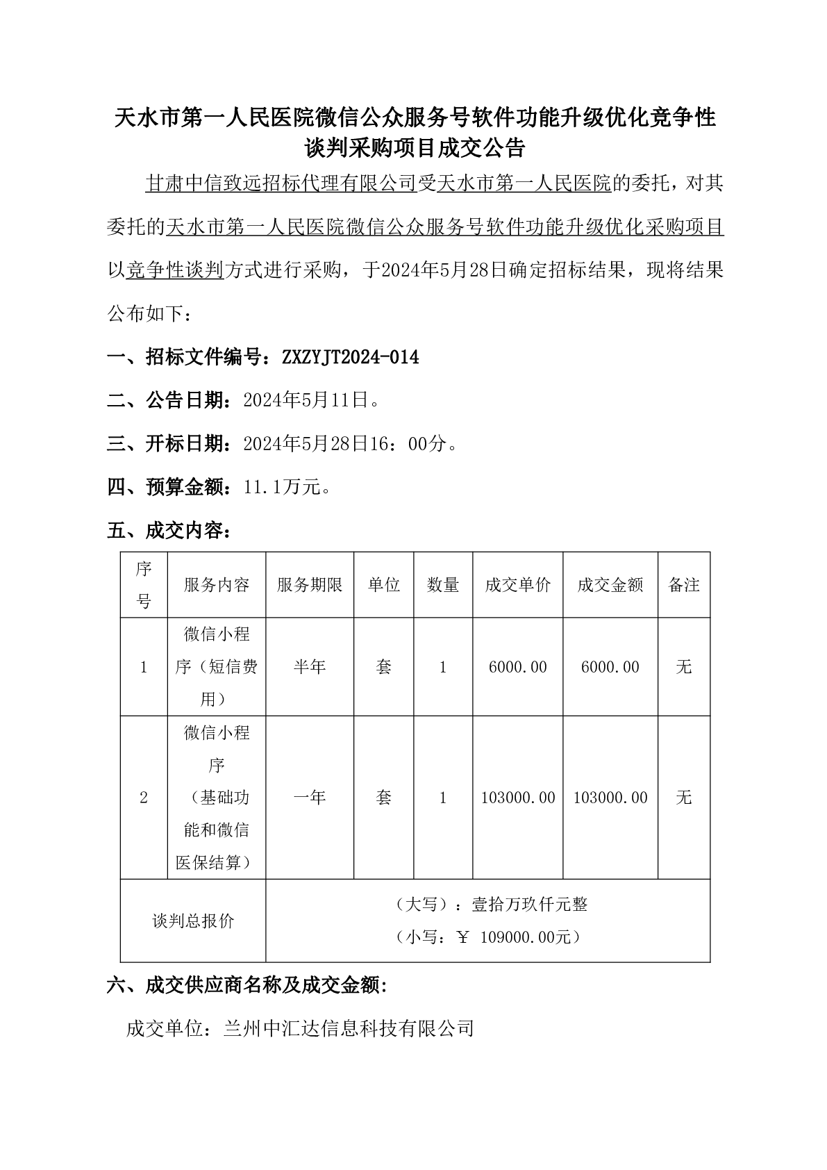 天水市第一人民醫(yī)院微信公眾服務(wù)號(hào)軟件功能升級(jí)優(yōu)化競(jìng)爭(zhēng)性談判采購(gòu)項(xiàng)目成交公告